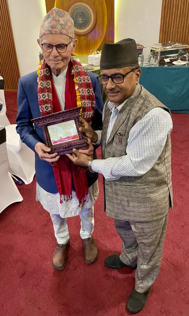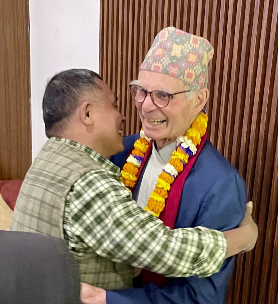 Bild rechts: Dev Prasad Tripathi, guter Freund und langjähriger Schulleiter in Malekhu überbringt seine Glückwünsche