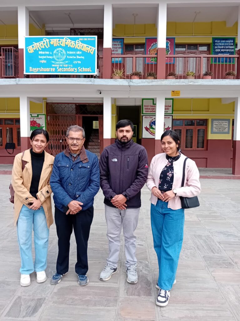 Der Empfang unserer großen Delegation aus Kardiologen, Kinder- und Augenärzten sowie der Dentalabteilung war dann, wie in Nepal üblich, ganz großes Kino! Mit Blumensträußchen und Shawls reichlich beschenkt hatten wir den Parcours durch die vollständig angetretene Schülerschaft zu absolvieren und wurden von Schulleiter Bodharaj Silwal und unserem lieben Freund Dev Tripathi (mittlerweile der amtierende Vorsitzende des Schulkomittees und wichtigster Ansprechpartner für die NHK) sehr herzlich empfangen. Selbstverständlich nicht ohne den Verzehr eines gemeinsamen Dal Bhat zum Mittagessen.