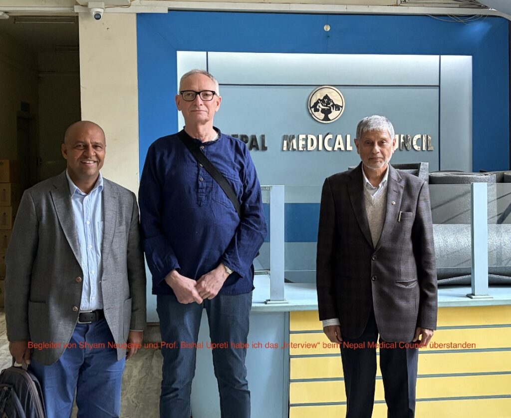 Am folgenden Tag ging es dann zum letzten Schritt des Akkreditierungsverfahrens: im Nepal Medical Council galt es , ein „Interview“ zu bestehen. Begleitet von Bishal in seiner Funktion als Präsident des Nepal Center for Disaster Management (NCDM, die Partnerorganisation der NHK vor Ort) wurde ich von einer jungen Gynäkologin im Sitzungssaal empfangen. Bishal stellte den NCDM, die NHK sowie mich vor, im Gespräch mit der Kollegin mußte ich lediglich darauf achten, meine beiden vorherigen Arbeitseinsätze in Malekhu nicht zu erwähnen. Insgesamt ein entspannter Termin mit dem Austausch von Höflichkeiten und Visitenkarten- mit der Zusicherung, den notwendigen „Covenant letter“ zu erhalten waren die Formalitäten dann endlich abgeschlossen.
