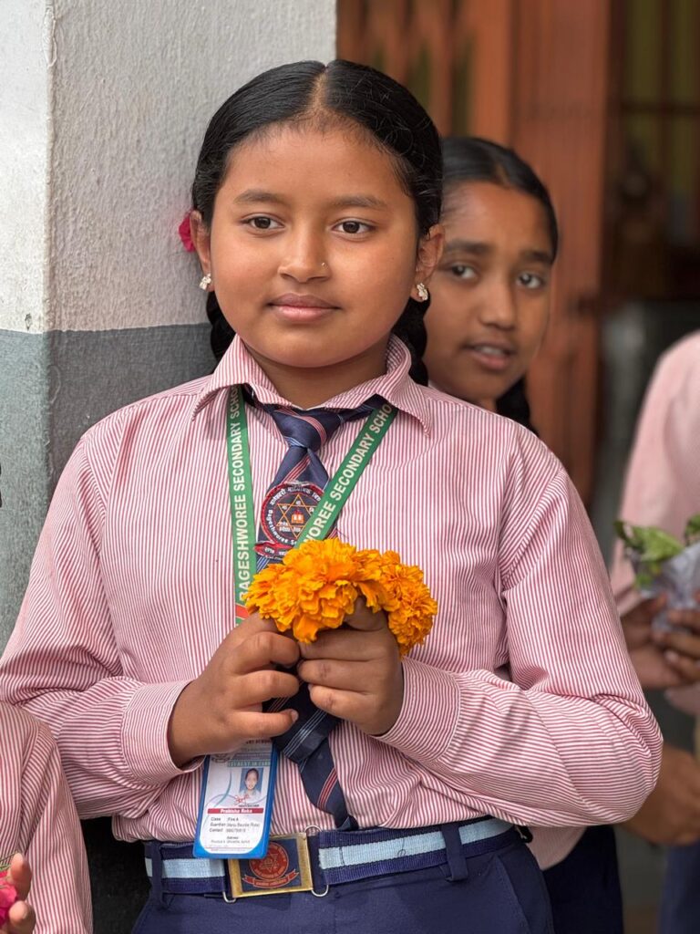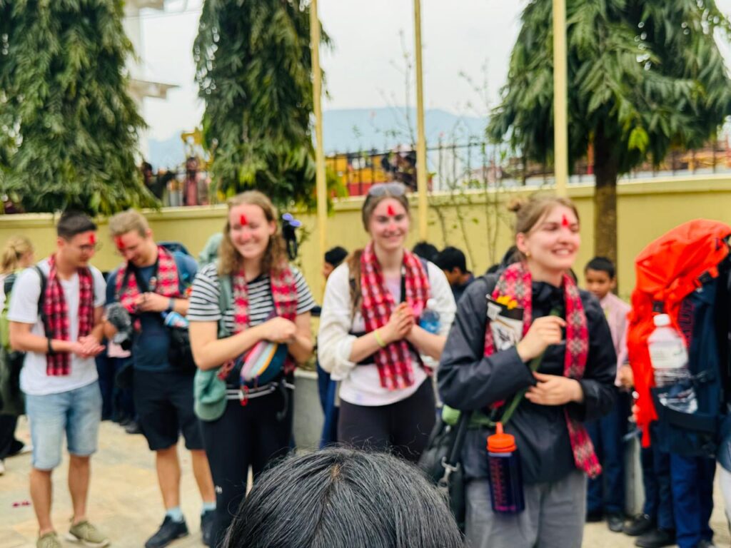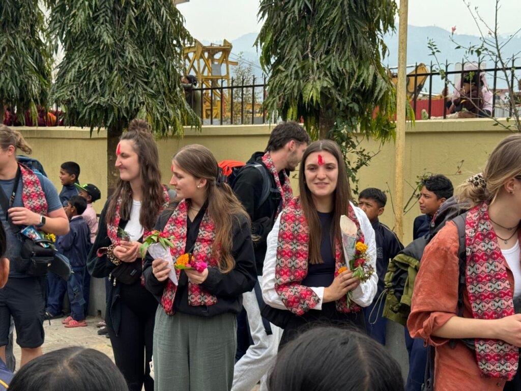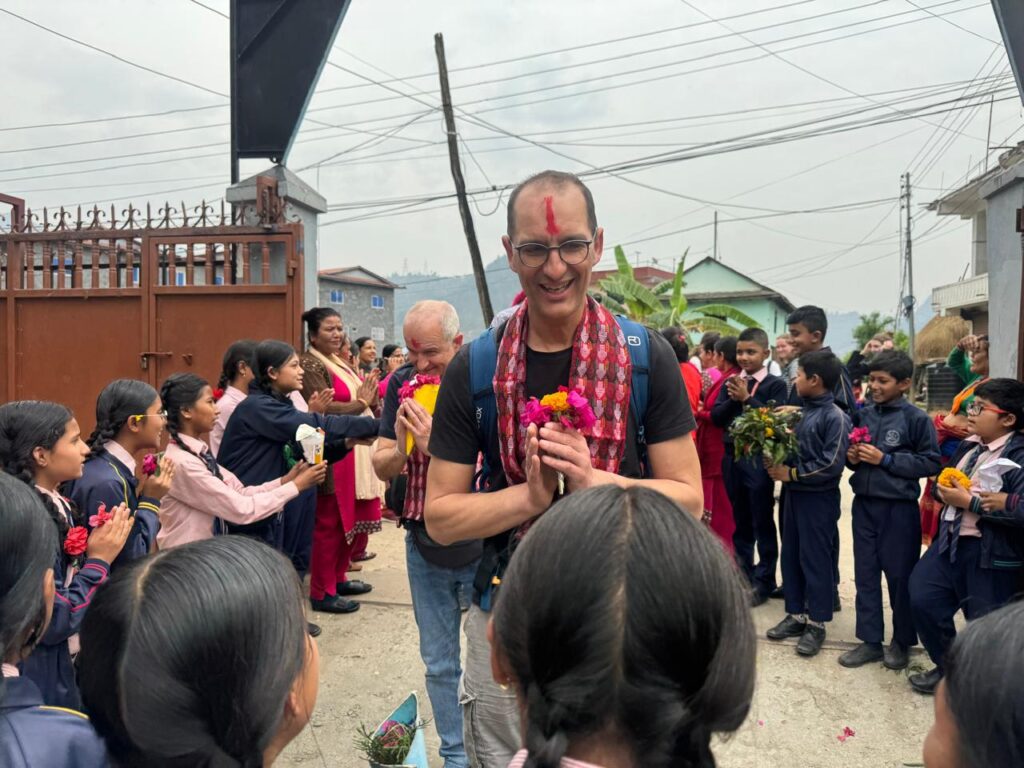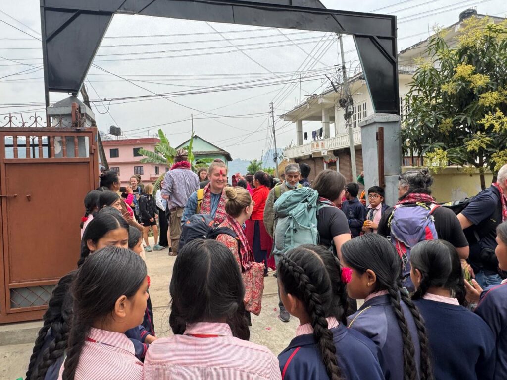 Die nachfolgenden Bilder zeigen die Reisegruppe bei der Ankunft in Malekhu. Zahlreiche Schüler*innen und die Schulleitung begrüßen sie im Schulhof.