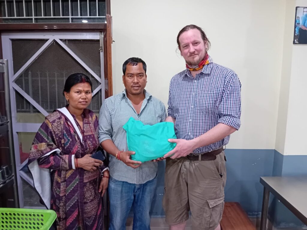Am zweiten Tag wurde unter anderem das Elternhaus von Niru Chaudhary besucht. Das Haus entstand nach dem Erdbeben 2015 mit viel Eigenleistung und Unterstützung der NHK. Tobias Geißler überreicht ein kleines Geschenk für die Tochter, die ihre Ausbildung zur Krankenschwester in Kathmandu begonnen hat.